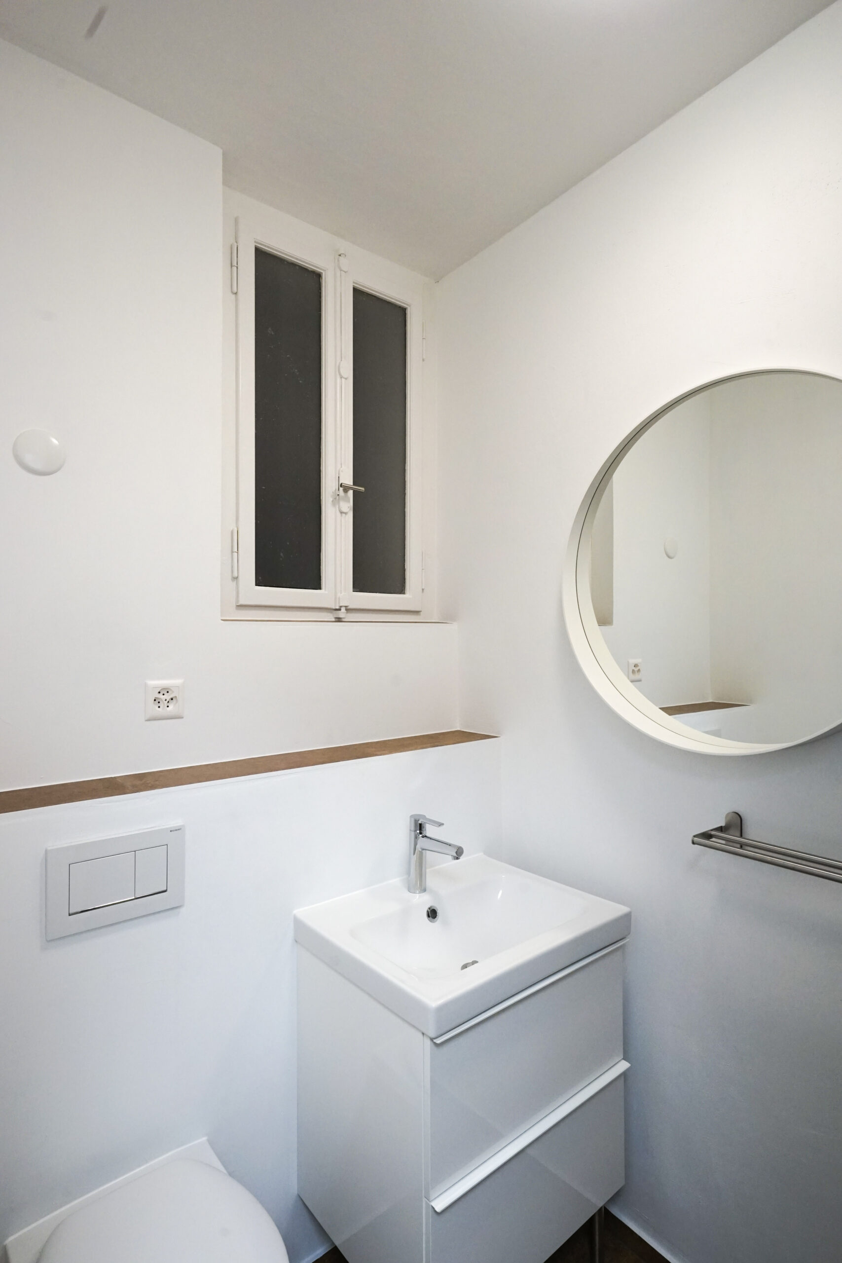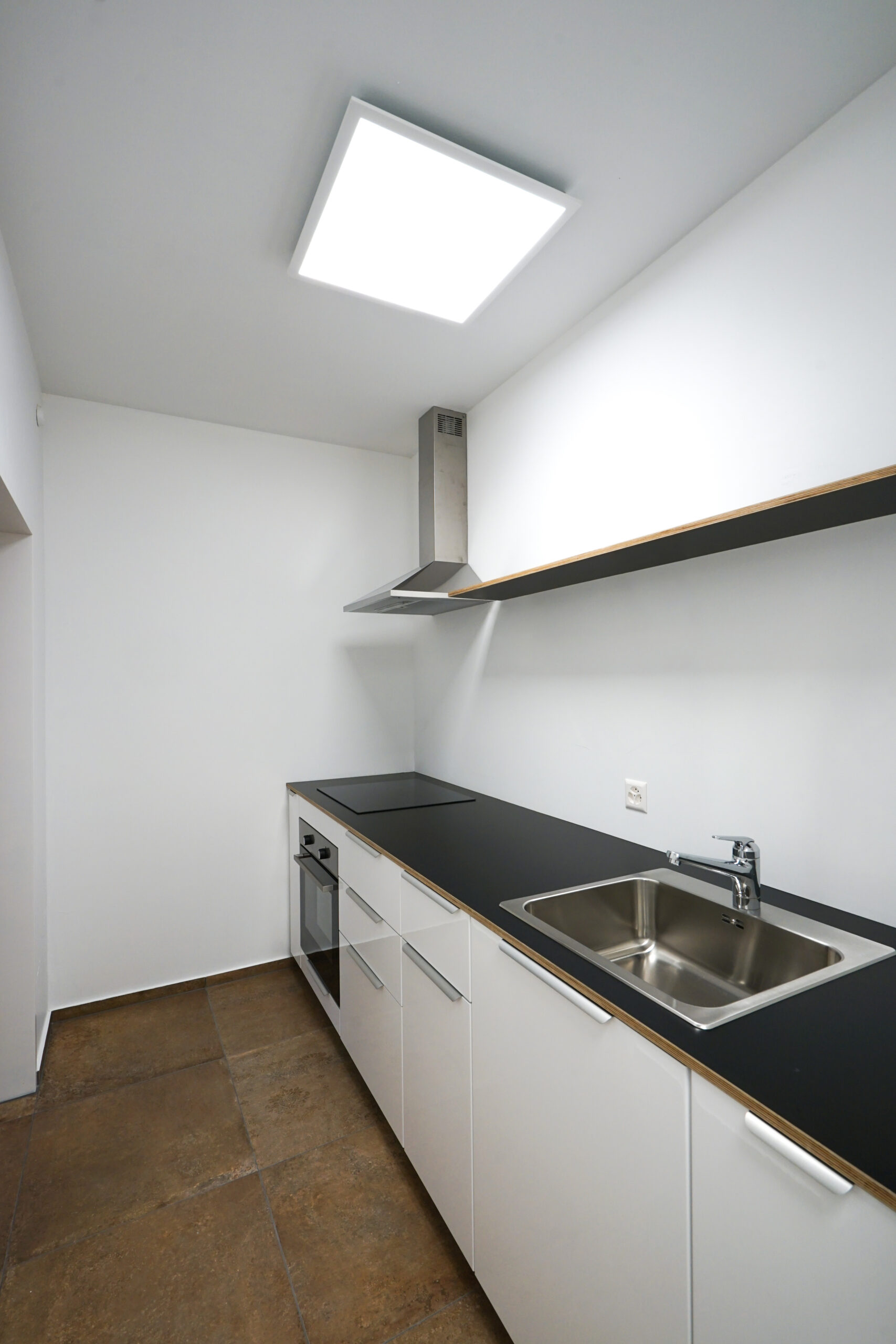 Die ehemalige Schneiderwerkstatt in der Altstadt von Rheinfelden wurde zur Wohnung umgebaut. Die noch vorhandenen originale Elemente aus den 1930er-Jahren, wie der Holzriemenboden oder die Decke wurden freigelegt und renoviert. Die alten Fenster waren in gutem Zustand und wurden belassen. Küche und Badezimmer wurden neu eingebaut.